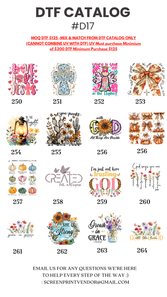 Welcome to Your DTF Addiction! Enjoy wholesale pricing on our catalog of designs ranging from 250 to 264. Mix and match designs and sizes as you please. The minimum order quantity (MOQ) is 50 sheets, which can be a combination of different designs.