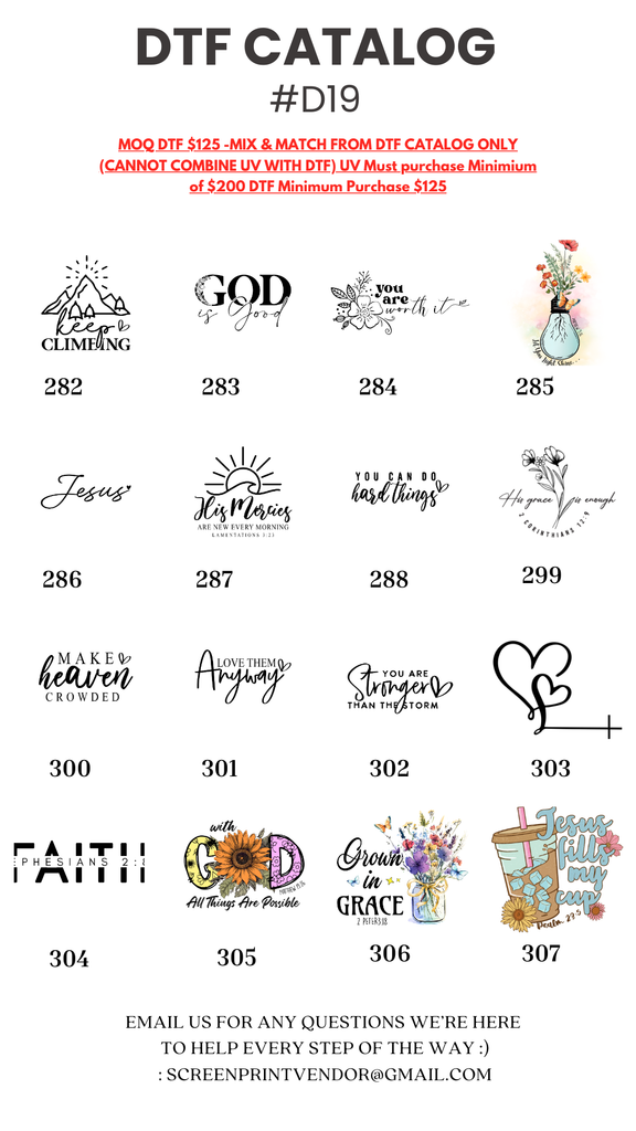 Welcome to Your DTF Addiction! Enjoy wholesale pricing on our catalog of designs ranging from 282 to 307. Mix and match designs and sizes as you please. The minimum order quantity (MOQ) is 50 sheets, which can be a combination of different designs.