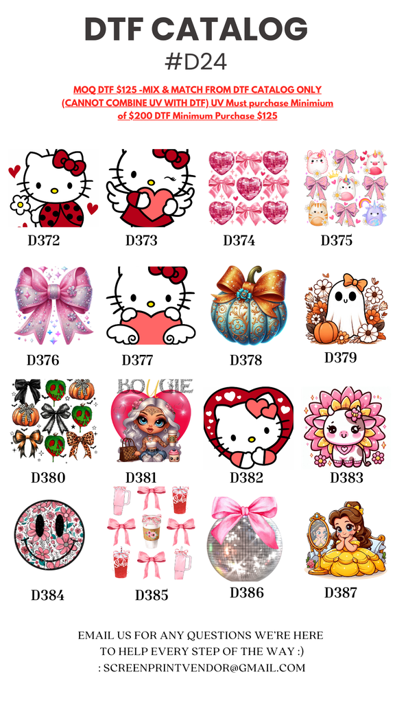 Welcome to Your DTF Addiction! Enjoy wholesale pricing on our catalog of designs ranging from 372 to 387. Mix and match designs and sizes as you please. The minimum order quantity (MOQ) is 50 sheets, which can be a combination of different designs.