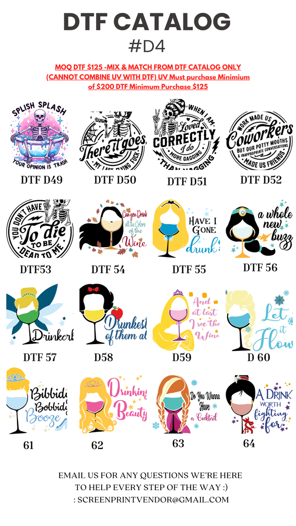 Welcome to Your DTF Addiction! Enjoy wholesale pricing on our catalog of designs ranging from 49 to 64. Mix and match designs and sizes as you please. The minimum order quantity (MOQ) is 50 sheets, which can be a combination of different designs.